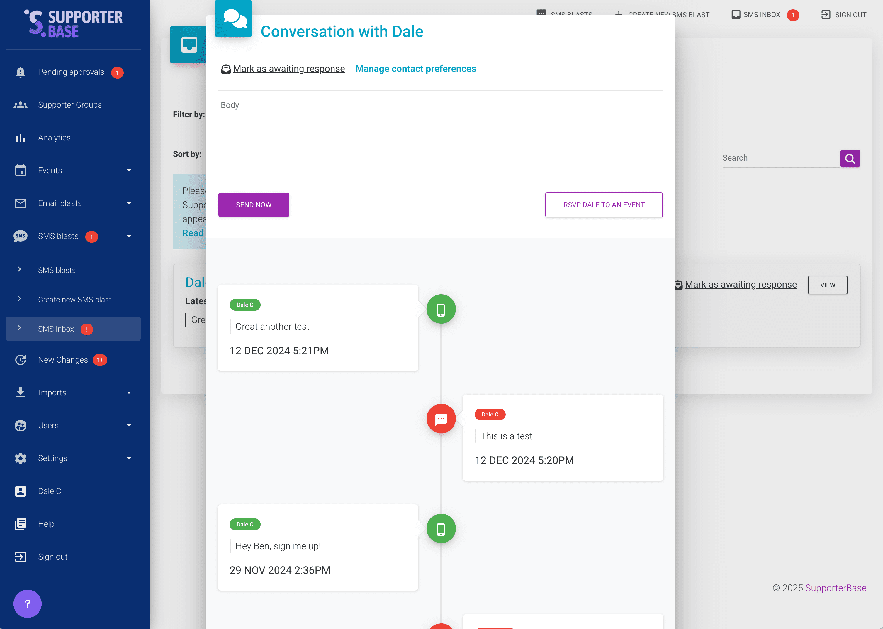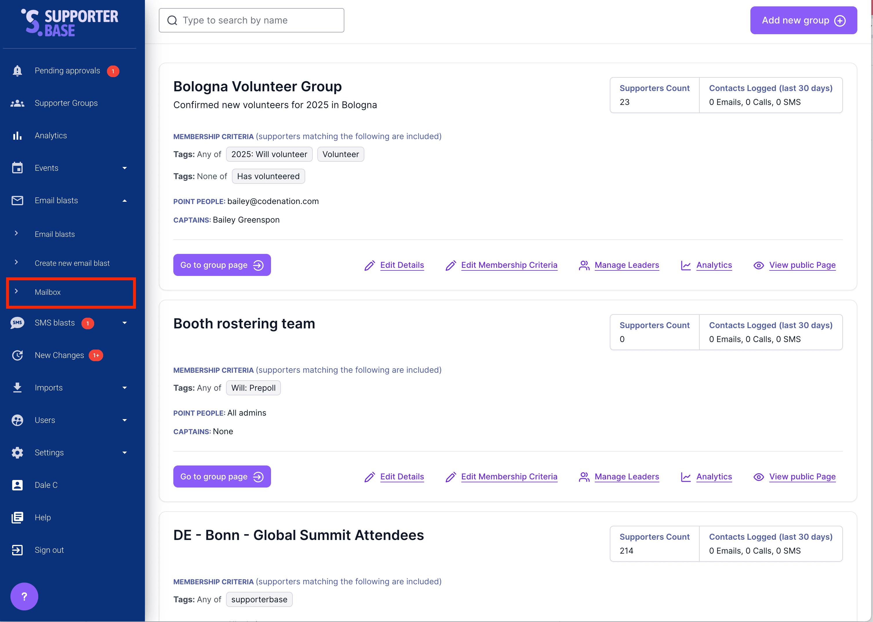 Each group in SupporterBase has an email inbox and an SMS inbox where leaders can:
