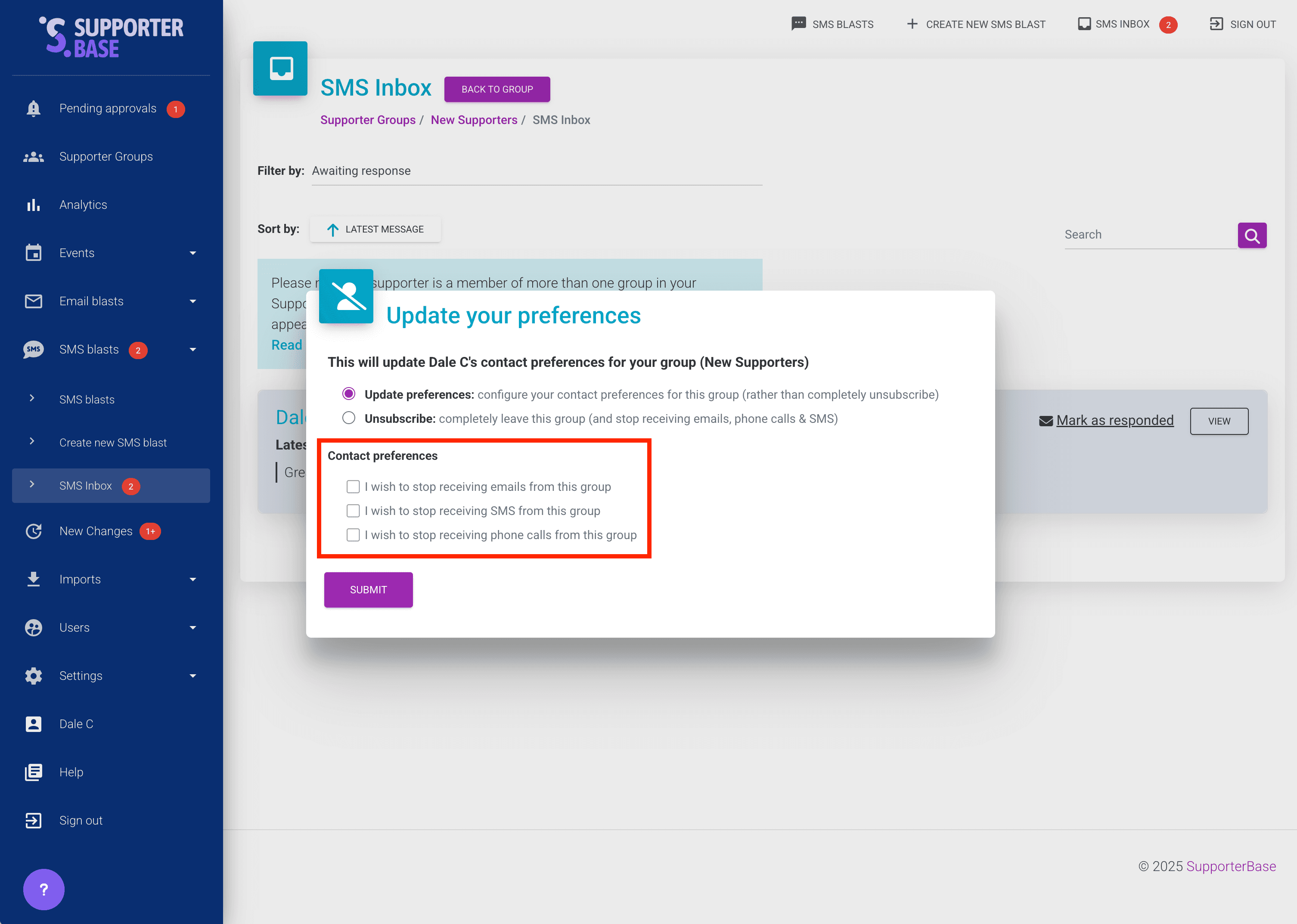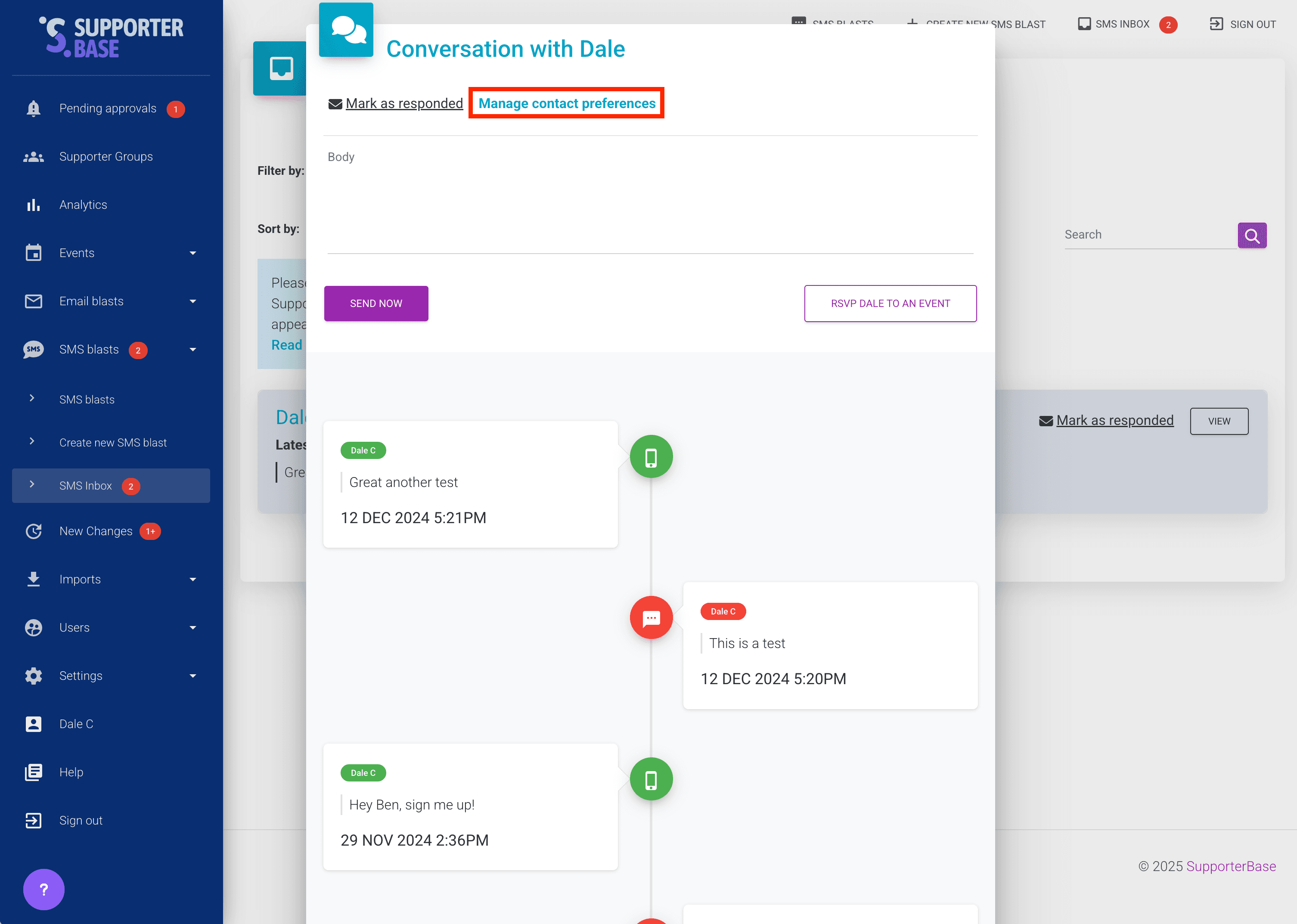 If a supporter requests to stop receiving messages, you can update their preferences from within a thread. Choose which channels to unsubscribe them from (email, SMS, phone).