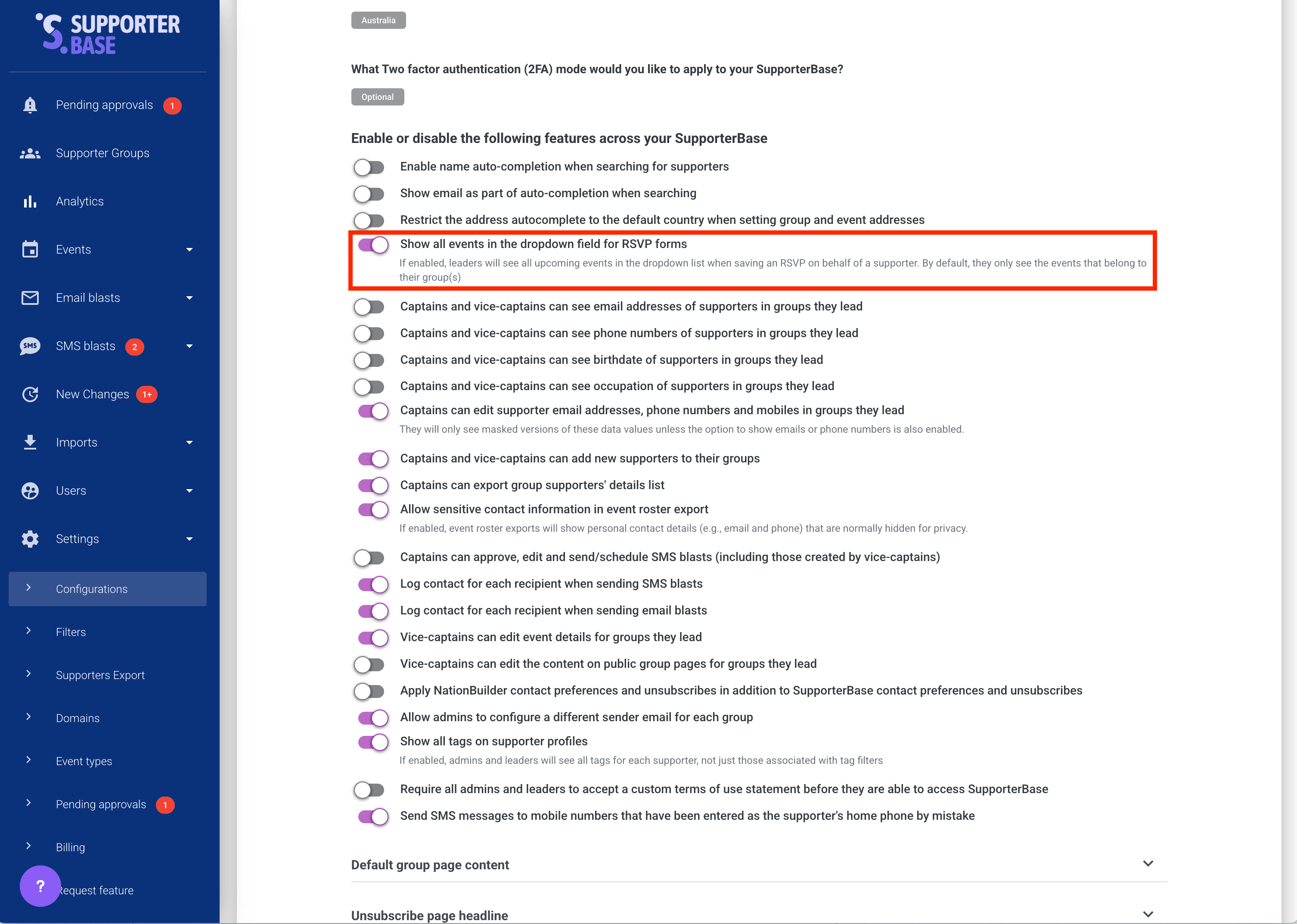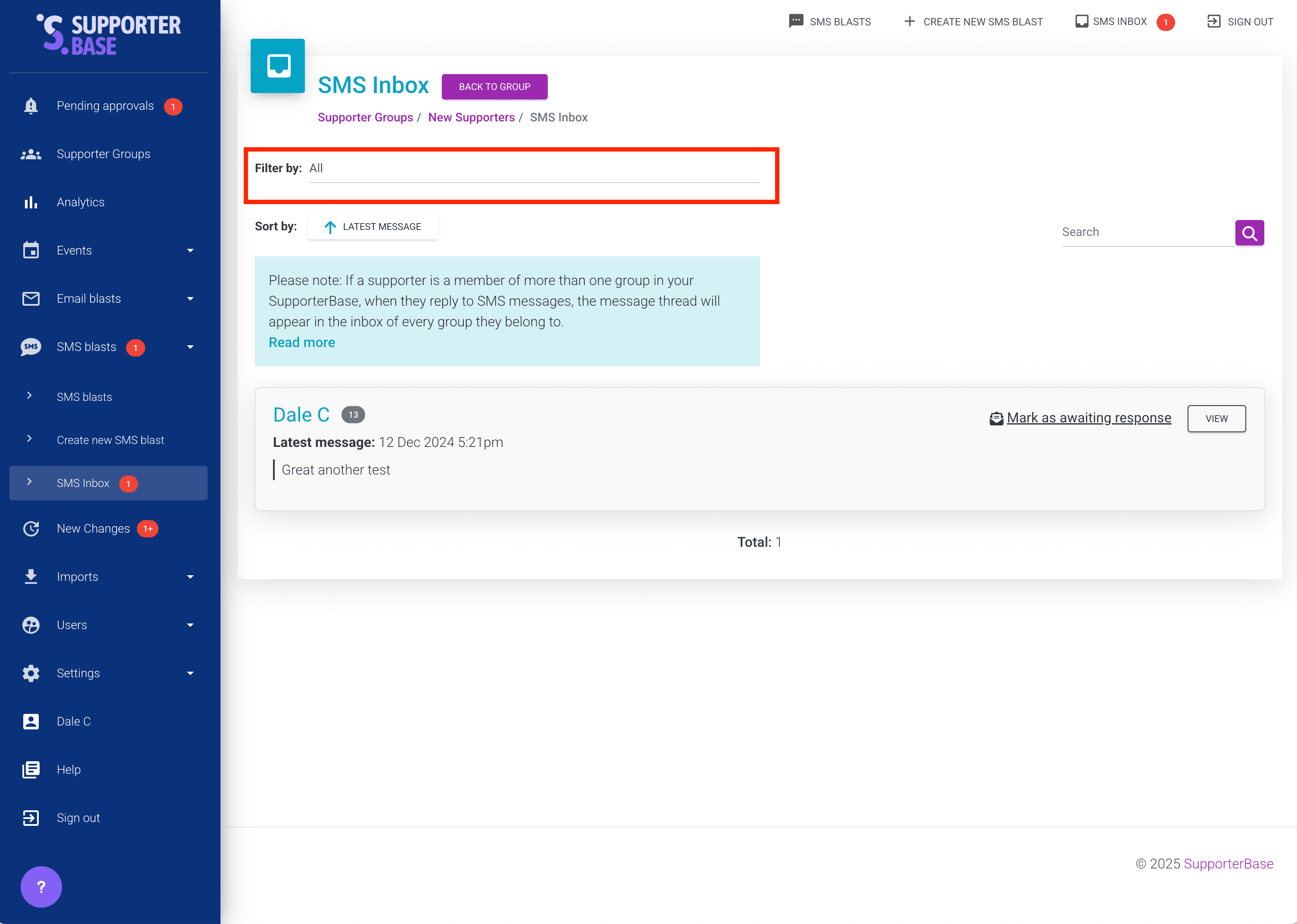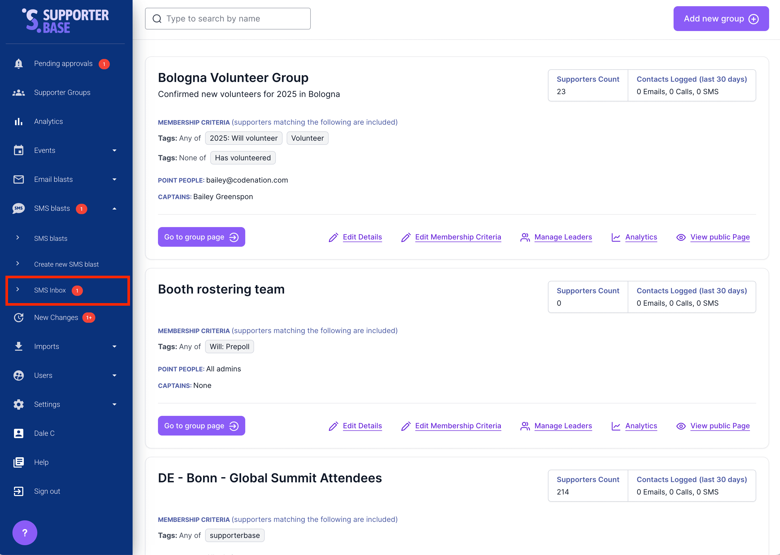 SMS threads: If a supporter belongs to multiple groups, their SMS replies appear in the inbox of every group they are part of. All groups share a single organisation-wide phone number (via Twilio). The only way to isolate replies to a single group would be to purchase dedicated Twilio numbers per group (a decision for your organisation).