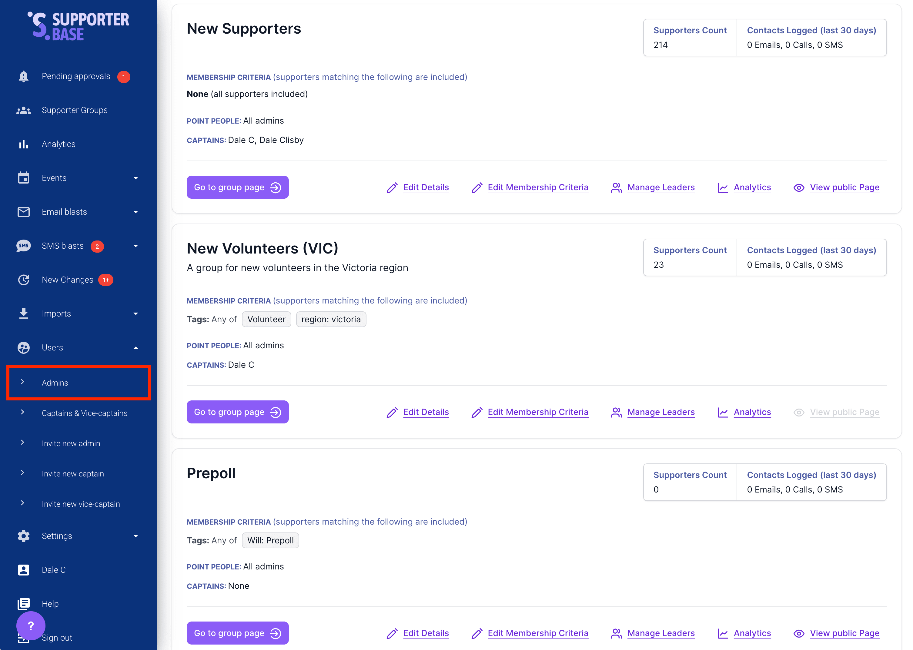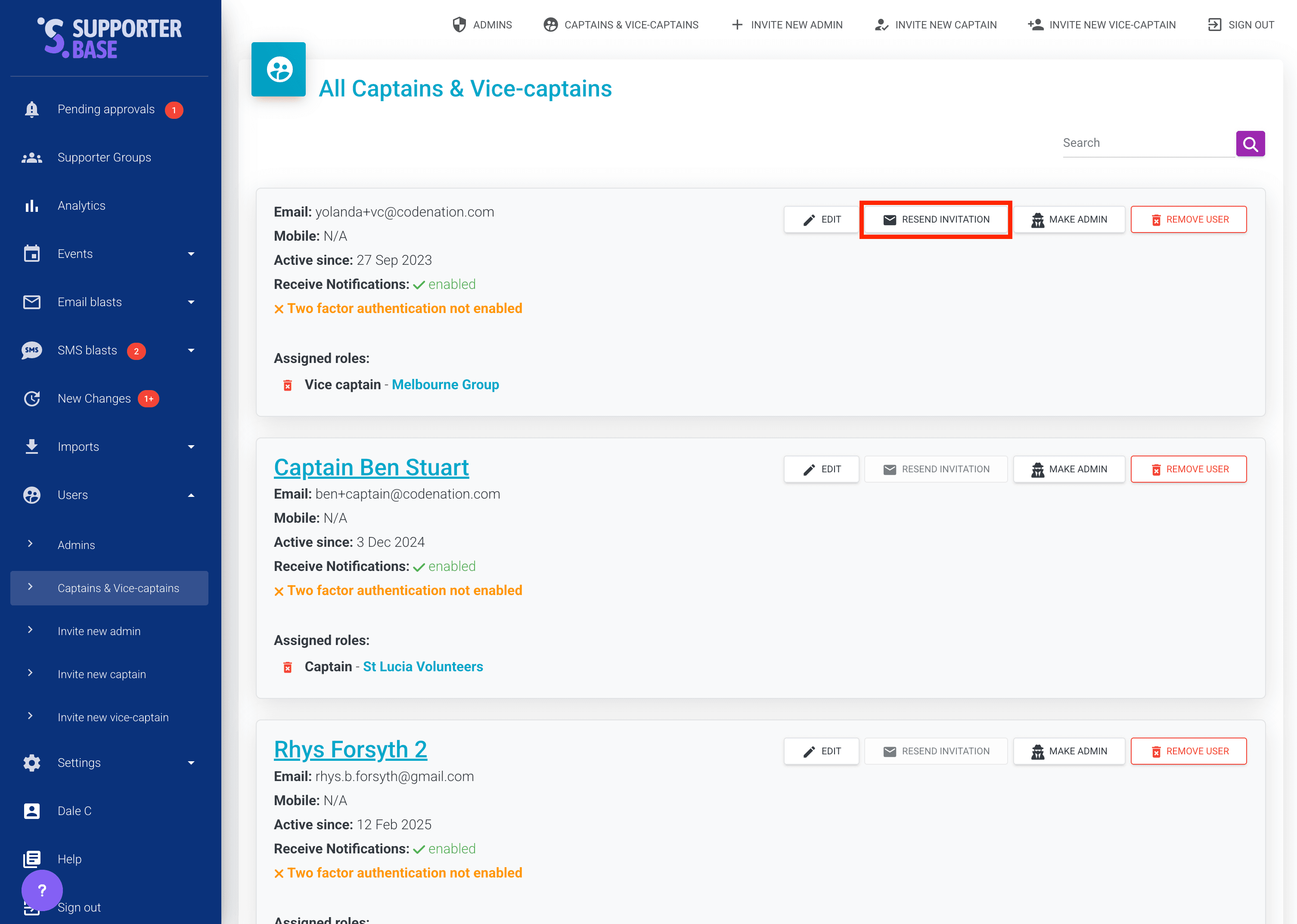 - Navigate to Users > Admins or Users > Captains and Vice-captains.