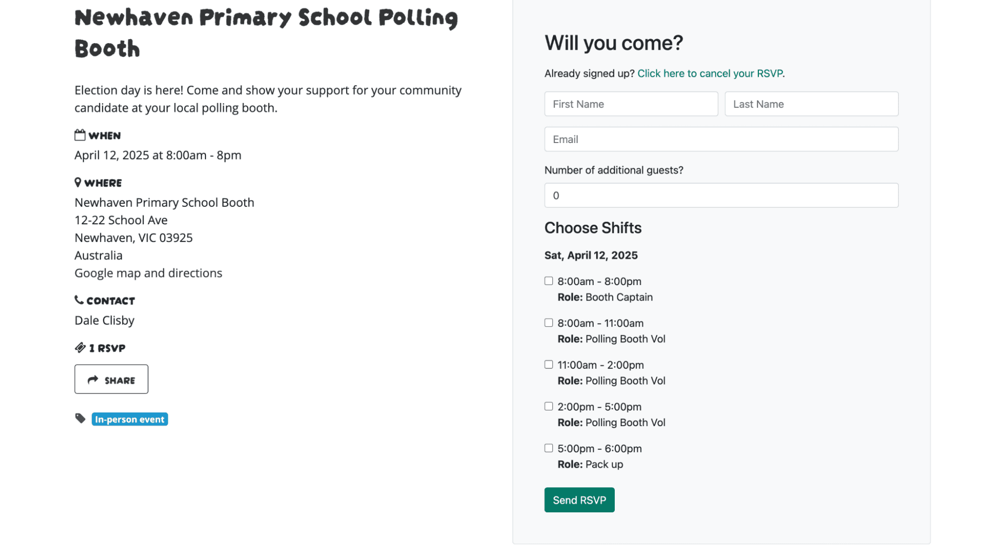 | Supporter self-signup | You want broad volunteer recruitment for general roles (e.g. greeters, setup/packdown) | Saves time; supporters choose shifts that suit them | Shifts display automatically on the event's public signup page |