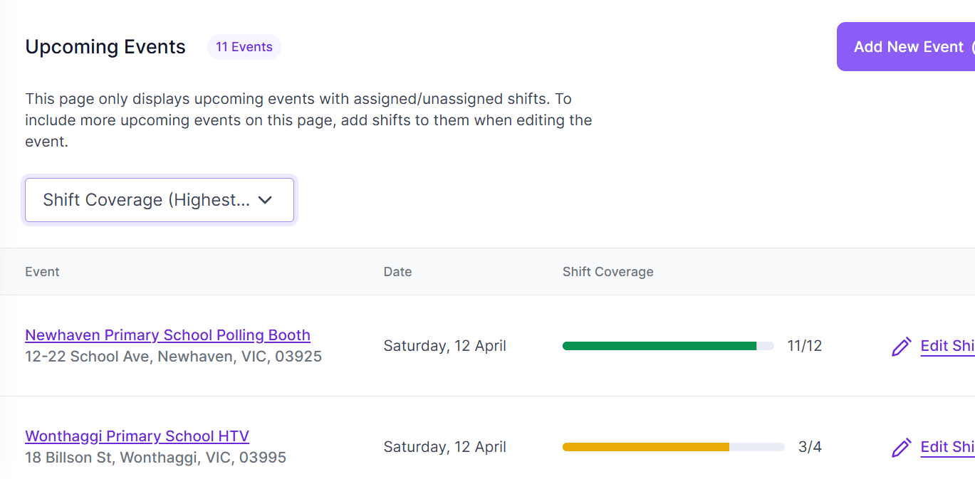 You can add shifts when creating a new event, editing an existing one, or bulk importing multiple events.