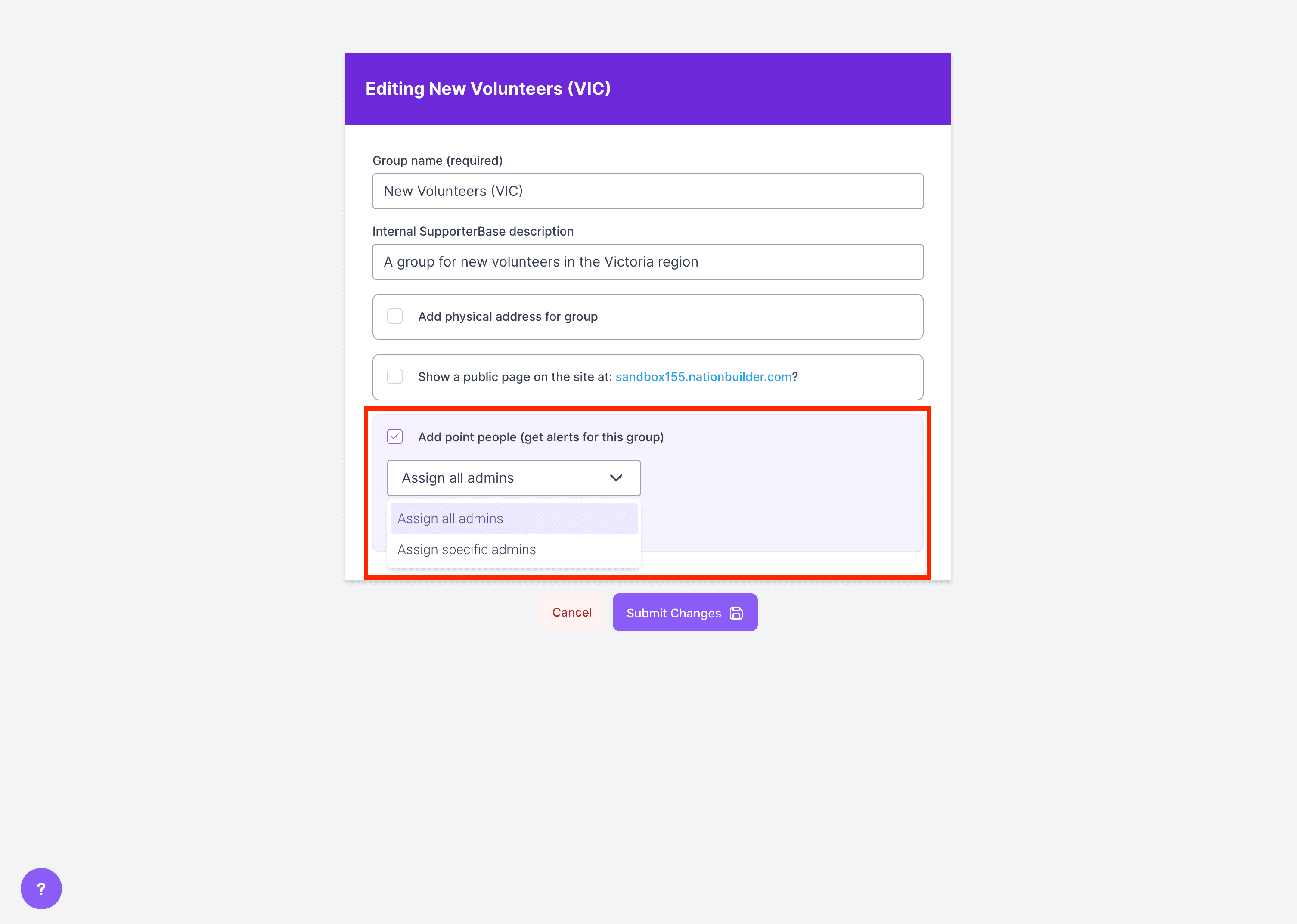- If you select "Only specific point people" and leave the text box blank, only captains (not admins) will receive general notification emails.